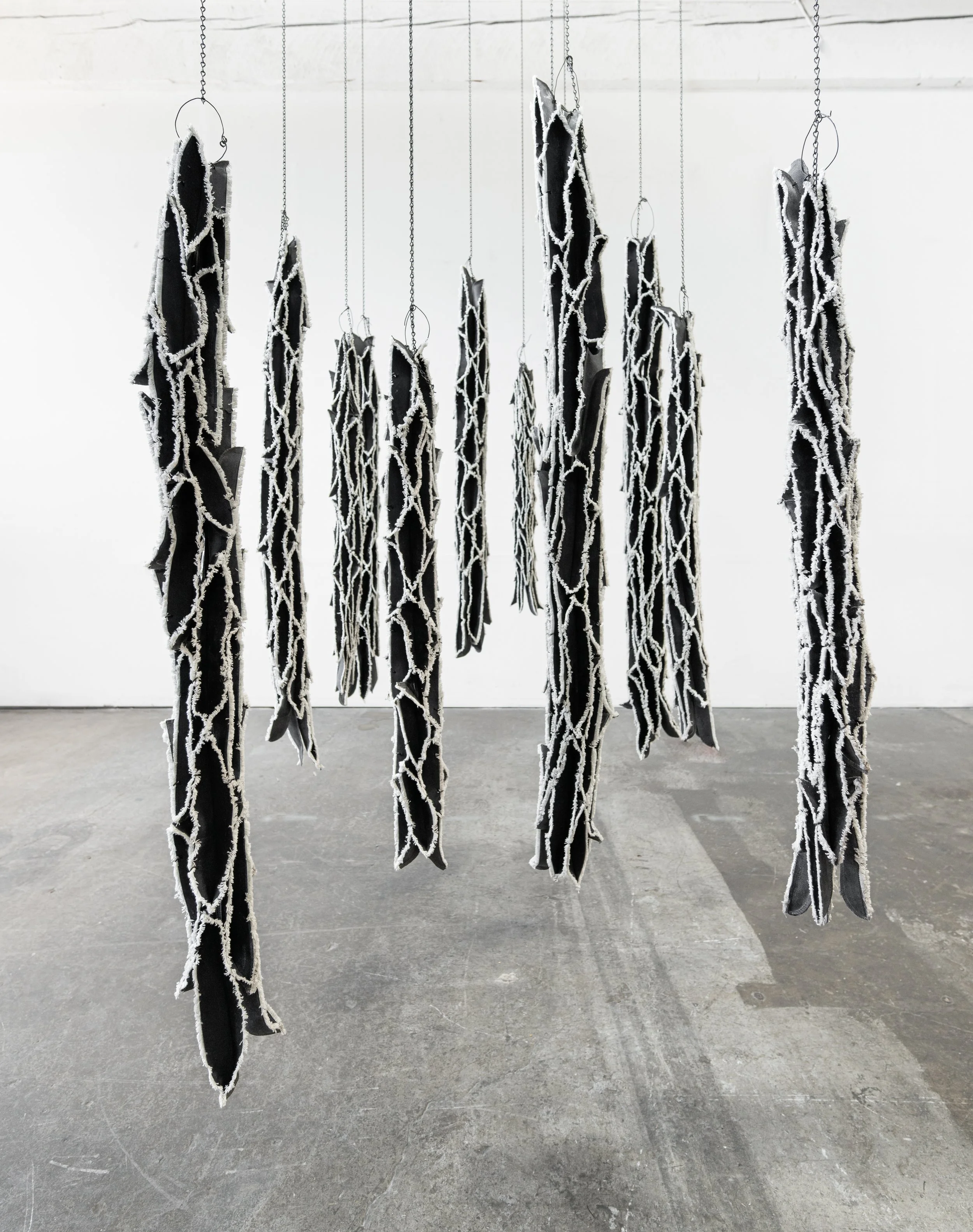 Warnings, 2022 - 2024, Cloth, wax, hog rings, baling wire, metal chain (14 units) varying sizes, 36 - 56 x 6 x 6 inches. Photo credit: Mario Gallucci