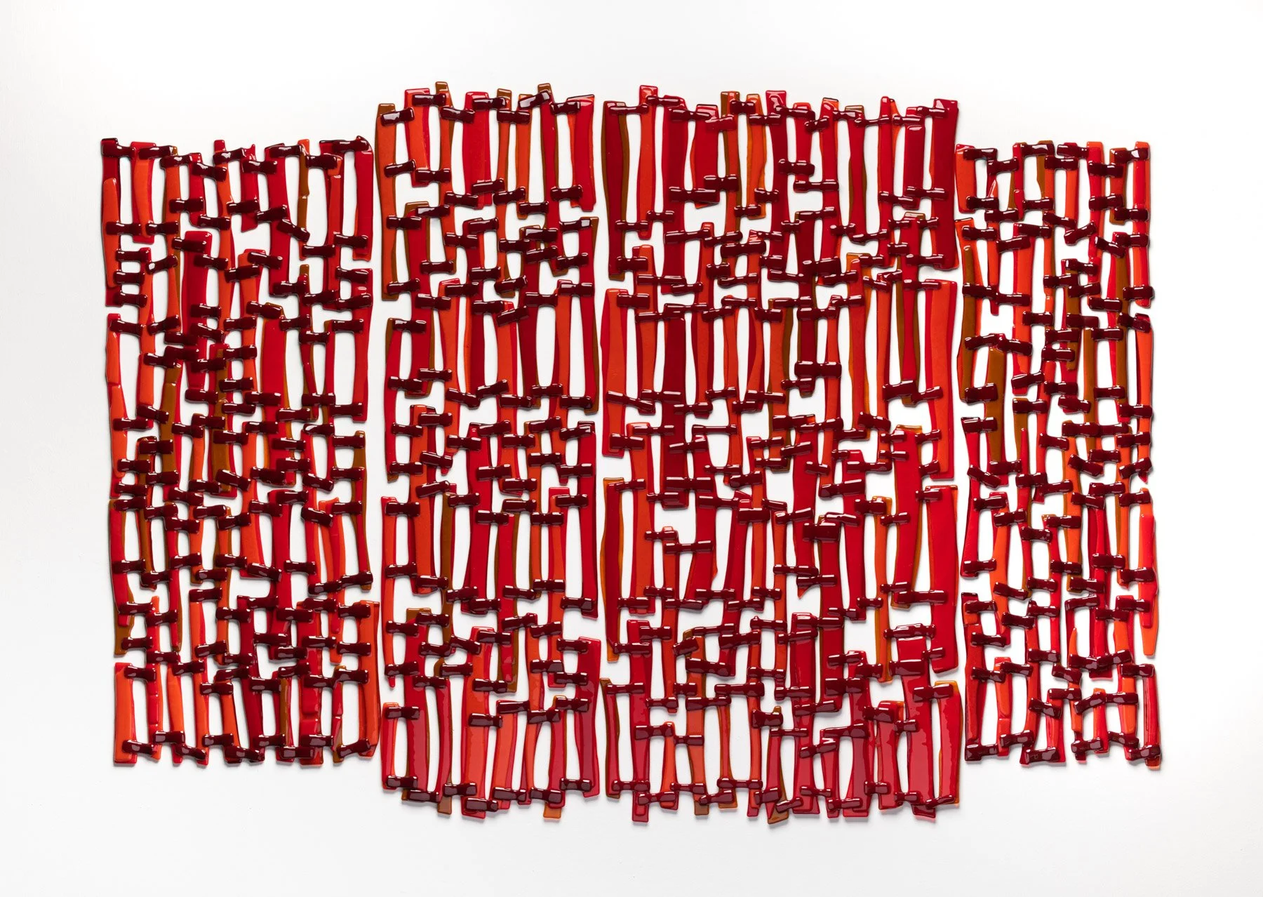 Common Connections is created from strands of glass in multiple colors of red connected and fused together by bars of one color and alludes to individuals or separate parts that become a whole through connections and kinship.