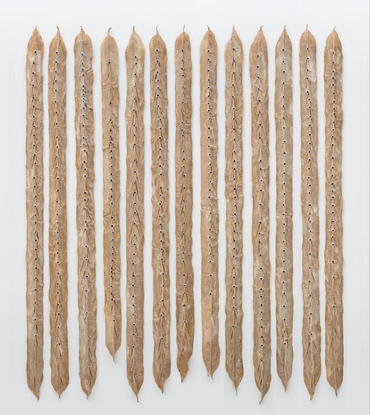 Demeter Does the Math (and Cries) ᏗᏎᏍᏗ ᎤᎬᏩᎵ ᎾᏛᏁᎲ “ᏗᎻᏔ” (ᏃᏊᎴ ᎠᎶᏱᎲᎢ) disesdi ugvwahli nadvne “Dimita” (nowle adlohyihv’i), 2000, Waxed cloth, shell casings, thread, wood, 80 x 66 x 3.5 dimension variable (13 units); Photo credit: Dan Kvitka
